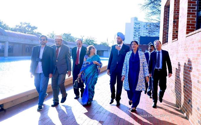 Ambassador Sarna and Dr. Avina Sarna walk to Freedom Hall with (L-R) Ravi Ponangi, Mohsin Bharmal, Antony Thaliath, Raz Rajdan, Vice Consul Timothy Jetty, and Consul General Nagesh Singh.