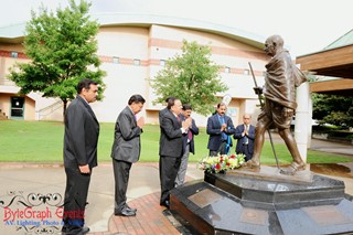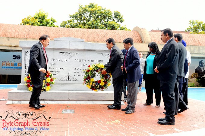 Dr. Vardhan visited Atlanta with the purpose of spending a day at the nation’s iconic CDC (Centers for Disease Control and Prevention) to understand the operations of running a central health organization for a large nation and how it manages epidemics and serious bacterial threats and outbreaks. A day before his meeting with the CDC, Dr. Vardhan spent the morning of June 26, 2014 paying homage at the Gandhi Statue at the Martin Luther King, Jr., National Historic Site, as well as placing colorful wreaths at Dr. Martin Luther King’s and Mrs. Coretta Scott King’s crypts. At the King Center, Dr. Vardhan was received and felicitated by Ms. Barbara Harrison, who presented the Minister with a King memento. Later that evening he was received with a rousing welcome by invited guests at a dinner reception hosted by Ambassador Ajit Kumar, India’s Consul General for the Southeastern United States, at the Palace Restaurant.