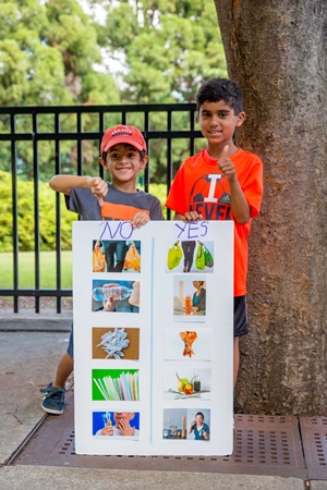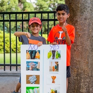 (Left) Kids in Atlanta show show what not to do, and what to do, to help stop plastic pollution!