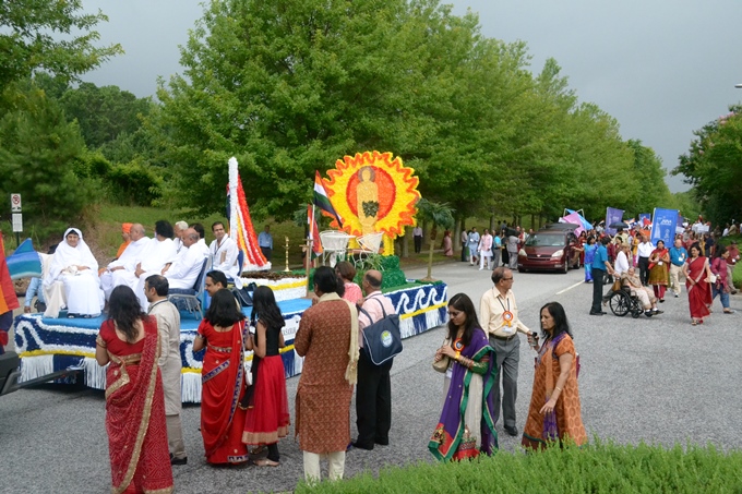Ladies carrying kalashes (earthen pots) led a great procession. A van and themed floats festooned with garlands carried the idol of Lord Mahavir. Some participants rode, sang devotional songs, and danced on the floats, while others marched waving Indian Tricolors, U.S. flags, and even Kenyan flags, and carried banners and posters, and some in colorful costumes and turbans sang and danced. Shouts of joy greeted the floats. Inside the main hall, the ceremonial opening began with a song “Maitri bhav nu pavitra zarnu” by Indravadan Bhavsar and an adult choir.