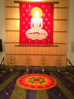The talented couple Smita Shah and her husband Rajesh Shah, with a team of volunteers and additional items supplied by Kalpana Patel, created stunning decorations. Ramila Lodhaya made a temple (derasar), with a jharokha on two sides of the entrance . Five cubicles decorated with paintings and sculptures replicated the 5 elements of Jainism: Panchkalyanak-Chyavan, Janma, Diksha, Kevalgyan, and Moksha. Arches resembled the famous temples of Palitana in Gujarat. A floral silhouette of Mahavir Swami Bhagwan and 8’ x 8’ styrofoam replica of the temples of Samat Shikhar, with the mountain painstakingly carved and decorated, took more than 4 months to complete and will be preserved at the Jain temple in Atlanta for future visitors.
