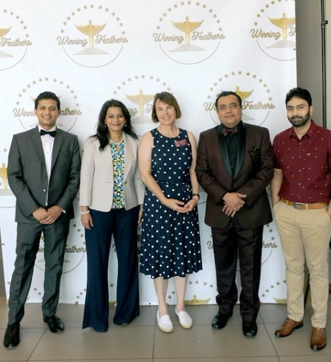 (Left) Parth Patel, CEO, Six Consulting and co-founder of Winning Feathers; Dr. Nazeera Dawood; Rep. Angelika Kausche (Johns Creek); Apurva Ghelani, founder and owner of Winning Feathers; and Pramod Sajja, Founder and President of chief sponsor Paramount Software.