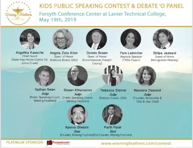 Chief guests attending were Rep. Angelika Kausche (Johns Creek), Angela Zera Allen (Advisory Board Member GSU and an angel investor); Dennis Brown, Forsyth County Commissioner; Shilpa Jadwani (Immigration Attorney); and keynote speaker, TEDx coach Pam Leinmiller. Ms. Leinmiller declared that the caliber of speeches given by the kids was very impressive and that it’s inspiring to see the commitment of Winning Feathers to prepare the next generation.
