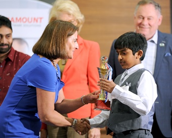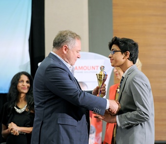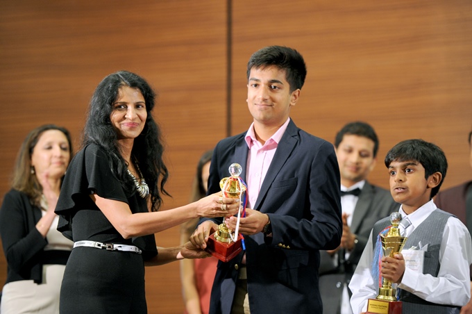Pratima Sajja, co-owner of chief sponsor Paramount Software, presenting award to Rishi Gowda, winner of the 14+ category, as winner Rishabh Alagharu on right looks on.