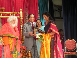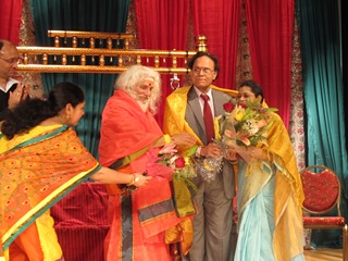 | Swamiji felcitating cancer specialist Dr. Nori Dattatreyudu and his wife Dr. Subhadra on Datta Jayanti Day. | Kala Vasudevan of Shrutilaya Carnatic music receiving the award. |