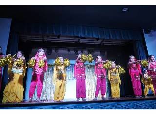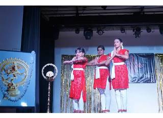 Mahek and Aadithya began the recital with an elegant, blissful invocatory “Ganesh Stuti” dance which was greeted with rousing applause. This was followed by an uplifting, riveting Mallari Bharatanatyam dance, named after a musical composition played on the nagaswaram, a traditional Indian instrument. The music of Mallari is said to bring good luck and prosperity. Dr.Desai said that many young students were performing for the first time and requested the audience to encourage and applaud their efforts to boost their morale and self-confidence. Preteens and teens with colorful pompoms performed a cheerful dance to the popular “Chance pe dance” song with Punjabi lyrics. In quick succession, students enthralled the audience with dances to favorite Bollywood songs like “Tune maari entriyaan,” “Manwa laage,” “Dhinka chikka,” “India Wale,” and “Radha Nachegi,” in multihued, shimmering costumes, facial and hair adornments, and jingling anklets, showcasing their dancing skills with well-coordinated and effortless moves, poise, youthful exuberance, and confidence, which had the audience tapping their feet and clapping along. In the vibrant dance to “Tu meri,” the dancers showed precise coordination in different moves and formations. At one point, the lights were dimmed and they created awesome colored patterns with LED lights. In another engaging dance to the song “Bang bang,” four dancers sported pink or blue hats. In the dance to the song “Chittiyaan kalaiyaan” with Punjabi and English lyrics, the Academy’s two senior students dazzled the audience with their energy, coordination, leaps and use of ribbons.