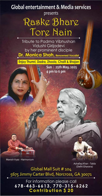 On May 27, a wonderful classical and Semi classical concert was organized by shri. Mustafa Ajmeri, Global Entertainment & Media services in memory of Padma Vibhushan Girija Devi at Global mall, Atlanta, USA. An amazing artist, Dr. Monica Shah