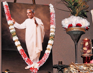 (Right) A garland adorns the image of Sadhu Vaswani for his memorial at the Carter Center.