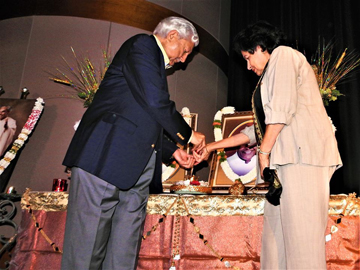 Emcees Anjali Nagrani and Priya Sahetiya welcomed a crowd of over 300 attendees. Chief guest was Mr. R. K. Sehgal, former Commissioner of Georgia, Industry, Trade and Tourism, and member of the Board of Directors of Pharmacy Industries International, India, Northside Hospital, the Carter Center, and Southern Center for International Studies in Atlanta. Mr. Sehgal and Mrs. Surishtha Sehgal lit a candle in honor of Sadhu T. L. Vaswani and Dada J. P. Vaswani. Geeta Mehrotra, Chief Executive Officer, Sadhu Vaswani Center Atlanta, and organizer of this event, garlanded Dada’s portrait along with event co-chair Neera Bahl and satsang coordinator Asha Advani.