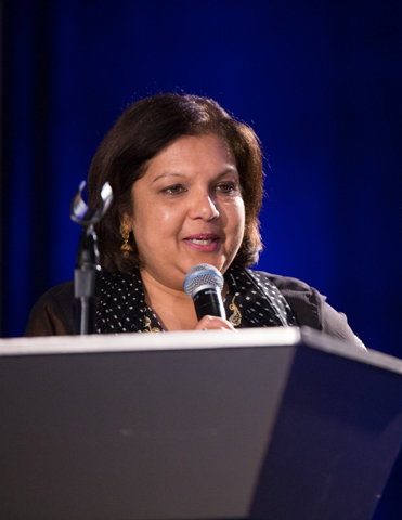(Left) Sonjui Kumar, past president of SABA, and now serving on its National Advisory Council, addressing the audience.