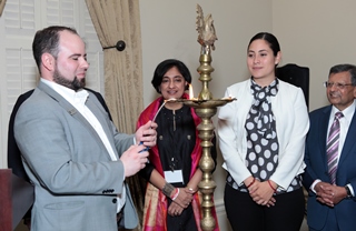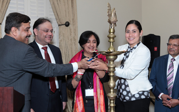 Lighting of the lamp with GIACC Chairperson Unmesh Mishra, CGI Nagesh Singh, President of GIACC Anita Ninan, Deputy Director of Mayor’s Office of International Affairs Vanessa Ibarra, and Dr. Jag Sheth. (Photo: Vinod Devlia) |