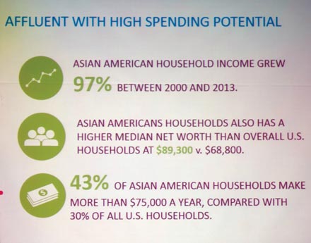 The segment has grown at a rate of almost 58 percent between 2000 and 2013, mainly spurred by immigration. This is more than 4.9 times that of the general population. On top of this, the average Asian American household’s income continues to soar and represents the highest of all multicultural segments. Their spending power outpaces even that of the coveted Millennial demographic, those currently in their 20s and early 30s, by nearly 40 percent.
