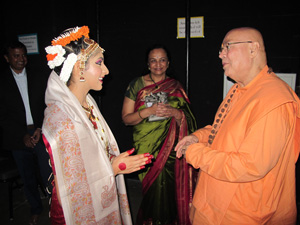 (Left) Swamiji speaking with Aditi Chunduru on her Bharatanatyam dance debut, after felicitating her dance guru, Indrani Parthasarathy.