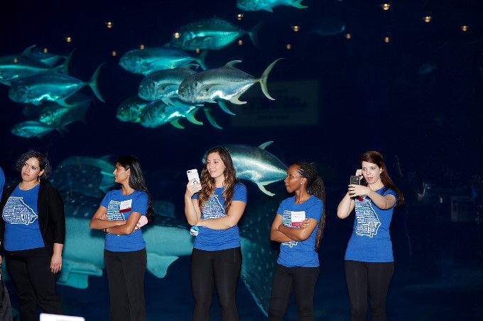 Volunteers in New American Pathways teeshirts with fish at the Georgia Aquarium event. (Photo: Randmc Photography)