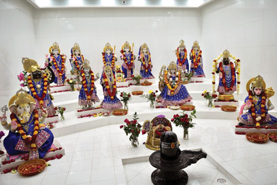 On Saturday all the deities of the Mandir were infused with energy by mantras and rituals. After Ganesh puja, yantras of each deity were placed on the pedestal of the respective murti to officially commence the Pranpratishtha and Shikhar Abhisheka Mahotsav. Sarva Devata Vandan ceremony was obeisance to all the deities: Lakshminarayanji, Shri Ramji, Laxmanji, Sitaji, Hanumanji; Ganeshji, Hanumanji, (Das Swaroop) Shrinathji, Shri Venkateshvar Swamiji, Shivalinga, and the Navgrahas. Trustees were provided with a puja thali with which they did Annadhivaas, Jalaadhivaas, and Pushpaadhivaas, consecrating the deities in grains, water, and flowers. Two members from each trustee’s family then did Bimba Snaan, bathing the image of their chosen deity in a mirror. The priests then connected all the deities by tying a sacred thread to each other, the Shivalinga. The actual infusion of pran, life force, was done by performing Nyaas by three designated priests led by Sri Sai Swarna.