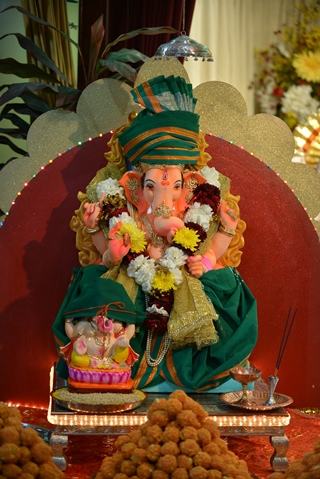 (Left) Ganapati sthapana. Ladoos are placed before Lord Ganesh.