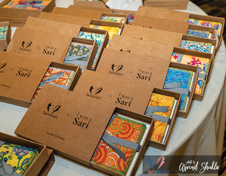 It was a packed house abuzz with energy and excitement. People mingled and shopped at the enticing trunk show. Tables were laden with merchandise including note cards, purses, jewelry—all handmade from upcycled saris that help underprivileged women living in Mumbai’s slums. As the lights began to dim, the music’s thump began to pulsate, and the guests arranged themselves as the show began.