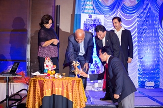 (Right) Deep prajwalan by chief guests Mr. & Mrs. Reddy, with Consul D. V. Singh, Sewa Atlanta President Pratap Singh, and Sewa Atlanta Media Coordinator Shyam Gupta.