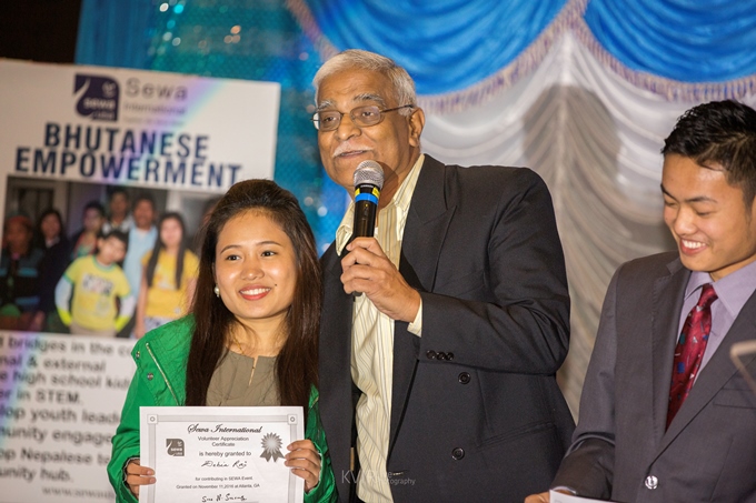 A number of fascinating presentations followed on Sewa’s humanitarian projects. Mr. Vivek Srivastav gave a presentation on his work for the Bhutanese Empowerment Program, giving facts and figures on the impressive inroads Sewa has made in the local Bhutanese community towards education, health, family services, etc. Sewa has always been committed to promoting excellence in education amongst the Bhutanese community. Towards this goal, two Bhutanese students, Umesh Mongor and Padam Koirala, were presented with scholarships for achieving excellent grades in high school.