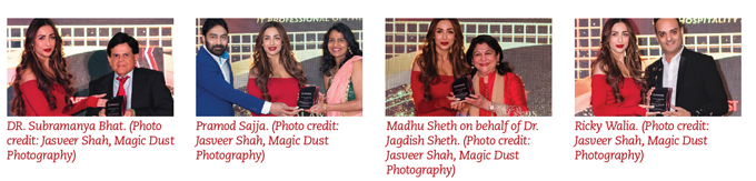 Awards for Outstanding Community Leadership & Success were presented by Malaika Arora to honorees Kanchana Raman, Dr. Subramanya Bhat, Sha Nila, Pramod Sajja, Padma Bhushan Dr. Jagdish Seth, Ricky Walia, Nida, Rachita Singh, and Jayanti Patel.