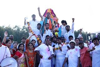 All this was followed with exciting matka-breaking by kids and adults. In the evening, a huge procession around the temple was accompanied by live music. It was exciting to watch a shower of flower petals from a helicopter! Maha Mangala Aarathi was performed reverently to the beating of the drums and traditional nadaswaram music every day. The HTA kitchen under Sairam Surapaneni provided food to all thrice daily.