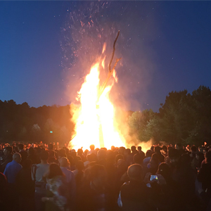 This year on Sunday, March 8, 2020, the weather was perfect for such a celebration. Approximately 2,000 devotees attended the evening celebrations in the grounds of the temple. The huge bonfire, almost 20-25 feet high, could be seen from a distance. Lighting the bonfire during Holi celebrations is part of Holika Dahan, a ritual that symbolizes the burning of evil powers. The devotees went round the fire with their offerings of coconuts, water, and popcorn to seek blessings for their family.