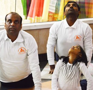 (Left) HSS GA Volunteers doing one of the postures of the Surya Namaskar.