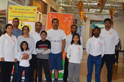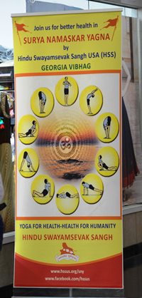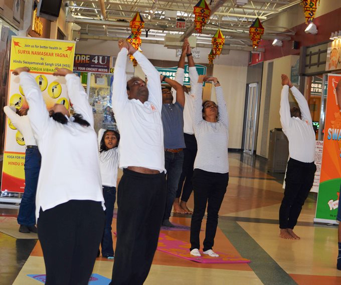Hindu Swayamsevak Sangh USA (HSS) held its tenth “Yoga for Health, Health for Humanity Yogathon” or “Surya Namaskar Yajna” from Makar Sankranti to Rathasapthami—this year from January 14 to 29, 2017. The annual 16-day event aims to create awareness about yoga and its advantages in achieving a healthy body, mind, and spirit. US Representative Bill Foster (D-IL) brought it to the attention of Congress that week. In Atlanta, HSS Georgia Chapter brought a “Flash Mob” style Surya Namaskar demo to the public at Global Mall on Saturday, January 21 from 1pm to 2 pm.
