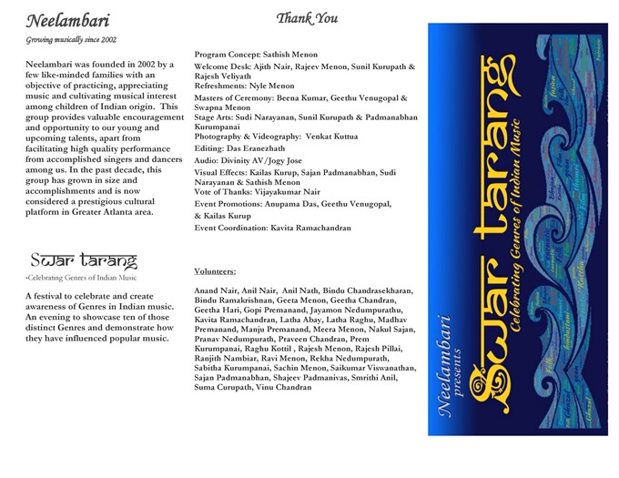 Neelambari (the group named after a raga) was founded in 2002 by a few like-minded families with an objective of practicing, appreciating music, and cultivating musical interest among children of Indian origin. This group provides valuable encouragement and opportunity to our young and upcoming talents, apart from facilitating high quality performance from accomplished singers and dancers among us.