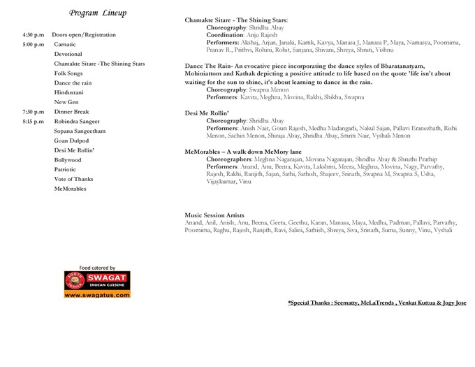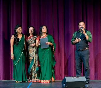 Post dinner we were treated to music from the east, Bengali Rabindra sangeet. This was followed by a very authentic presentation of Sopana sangeetam of Kerala. We were regaled by the very energetic Goan dulpod and some popular songs from the Bollywood genre. Before concluding the music segment, we were treated to some gems from the patriotic genre as well. The second half of the program was interspersed with a high-octane performance by the teens of Neelambari. The finale dance was a blockbuster as well with a medley of dances performed with high energy by the members of Neel family.