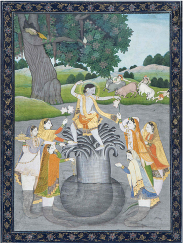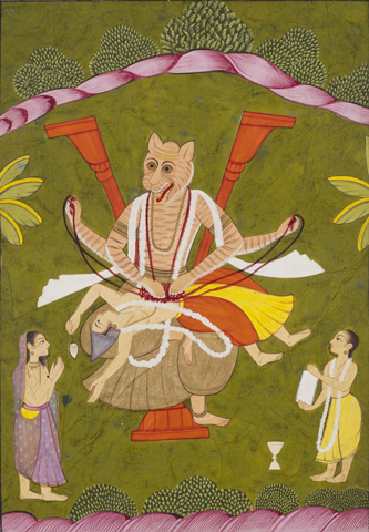 | Avatar of Vishnu: Krishna, [seen here conquering Kaliya, the serpent], India. 1810-1820. Pigments and gold on paper. Painting, courtesy of Harshna and Pyush Patel. (Photo: Courtesy of Carlos Museum) | Avatar of Vishnu: Narasimha. Late 18th century. Pigments on paper. Courtesy of Harshna and Pyush Patel. (Photo: Courtesy of Carlos Museum) | Avatar of Vishnu: Parashurama. India. Late 18th century. Opaque pigments and gold on paper. Courtesy of Harshna and Pyush Patel. (Photo: Courtesy of Carlos Museum) |