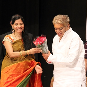 Seetha Vallurupalli presents a bouquet to Dr. Chukka Ramaiah (IIT Ramaiah). (Telangana Deputy CM Mahmood Ali appears on the right in the larger photo in the slideshow on Khabar's home page.)