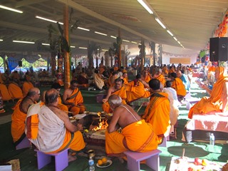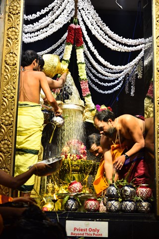 A spectacular aspect of any event at HTA is the decoration of deities by the priests. During this celebration, each day’s decorations were better than the last. The lamps lit all through the temple, it being the month of Karthika, accentuated the beauty. Chief architect of the Ati Rudra pavillion, Mr. Picchappan created a magnificent hall for this yagna.