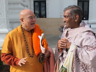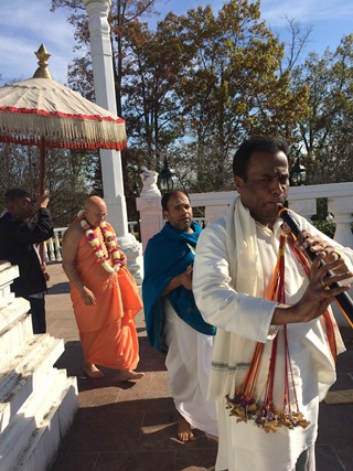 Pujas and homams included Ganapathi homam, Gau-puja, Chandi Saptha Sathi Parayana, Chandi homam, Rudra Homam at eleven Homa kundas, and Pavamana and Visesha Sarva Devata Homams. Archanas and parayana from 4pm to 7pm were followed with arathi, discourses, and cultural programs of dance and music. Theertha Prasadam was served to all from 8:30pm. Music of the nadaswaram (a double reed wind instrument in photo at left) by Muniswamy Lakshman and B. Srinivas, resident musicians of HTA, created an unforgettable atmosphere.