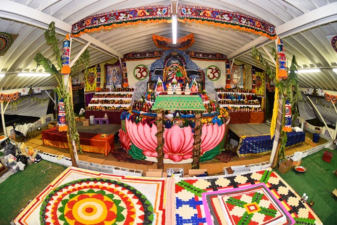 During early morning for eleven days, Swami Adhyatmanandaji conducted hour-long, free guided meditation and pranayama classes. He enthralled audiences with his commentary on Devi Saptashati and other topics. Brahmasri Narendra Kapre’s discourses in Sanskrit and Hindi were succinct, informative, and enjoyed by everyone. A highlight of the celebrations was a daily discourse on Devi Puranam and the divine mother by Santosh Kumar from Hyderabad, who is known for his talks on spiritual matters on Bhakti TV in India. His rich voice and mastery of the subject attracted many to his daily talks.