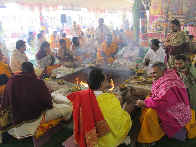The suggestion to conduct Ati Rudra Maha Yagna was made by an esteemed guest of HTA, the president of the Sivananda Ashram, Ahmedabad, Swami Adhyatmanandaji. Narender Reddy, HTA president at the time, then took the initiative, and a committee was formed in December 2014, under the leadership of coordinator Dr. B. K. Mohan; his wife, Rajyam Mohan; Dr. P. B. Rao, now president of HTA; Aravind Goli, puja committee chairperson; P. K. Raju, Dr. Sujatha Reddy, Krishna Kumar, Syamsunder Yellamraju, and Jaganmohan Rao. The well-respected Sanskrit scholar and Rig Veda pundit, Brahmasri Narendra Kapre of Hyderabad was invited to conduct the 11-day event, and vedic scholar Pannala Balu Sitharamanjaneya Sarma to lead the Satha Chandi Homam.