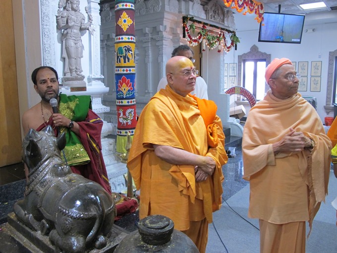 When the time came, they worked closely with HTA priests led by chief Vaishnavite priest Gopal Bhattar and chief priest of Siva temple Sri Srinivas Sarma. With the help of local ritwiks Hariharan and Abhiraman, and innumerable volunteers, this monumental vedic ritual was successfully completed on November 28, 2015 with thousands of people attending and participating in the celebrations. More than 130 ritwiks participated, many invited from India and some from other states within the US. Young ritwiks born and brought up in the US chanted Sri Rudram with perfection. Sacred water from many rivers and oceans all over the world was used in the 1008 kalasas (brass pots used for the ceremony).
