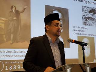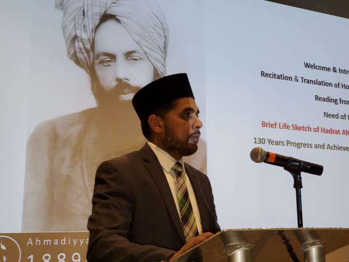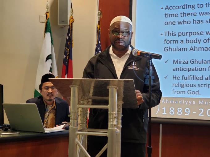 (Left) Imam Yahya Luqman speaking about the Ahmadiyya community's “130 Years: Progress and Achievements.”