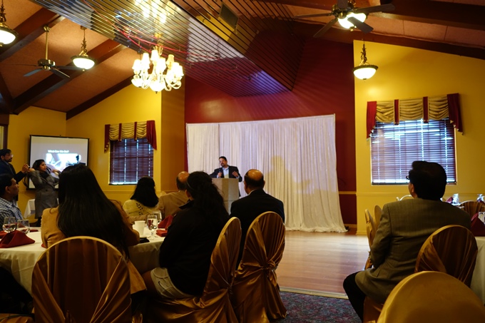 Shankar Vedantam stands at the screen, flanked by the Atlanta SNOMTrust volunteer committee of Ani Agnihotri and Madhu Iyer (left) and Ashok Kumar, Krishnadas Pisharodi, and Deepak Raghavan (right)—Dr. Seshu Sarma not pictured. (Photo: Suzanne Sen)
