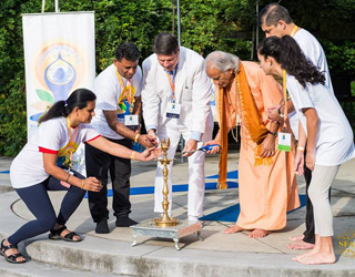 The enthusiastic and cheerful attendees rolled out their yoga mats and joined in performing the Common Yoga Protocol followed at the IDY. Led by a few seasoned yoga volunteers, they did warm up practices; standing and sitting asanas (postures); prone and supine asanas; kapalabhati and pranayama (breath altering practices); dhyana (meditation); and sankalpa (commitment to the truth).This was followed with Yoga Namaskar, Hatha Yoga, Surya Namaskar, guided meditation, and songs and dances for peace.