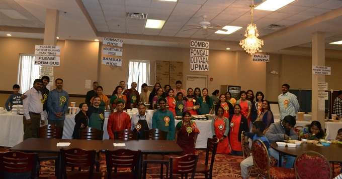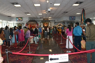 This year’s motto at the the HTA was “Service with a Smile.” With virtually no standing room in both temples, the flow of devotees was nevertheless ably managed by devoted volunteers. The overflowing vehicular traffic in the parking lots was directed to overflow lots by cheerful volunteers and shuttle operators who braved the cold weather with smiles. Hectic preparations had been under way for several days by kitchen volunteers under the leadership of P B Rao and Sairam Surapaneni. Delectable Indian food served on the day was testimony to their efforts.