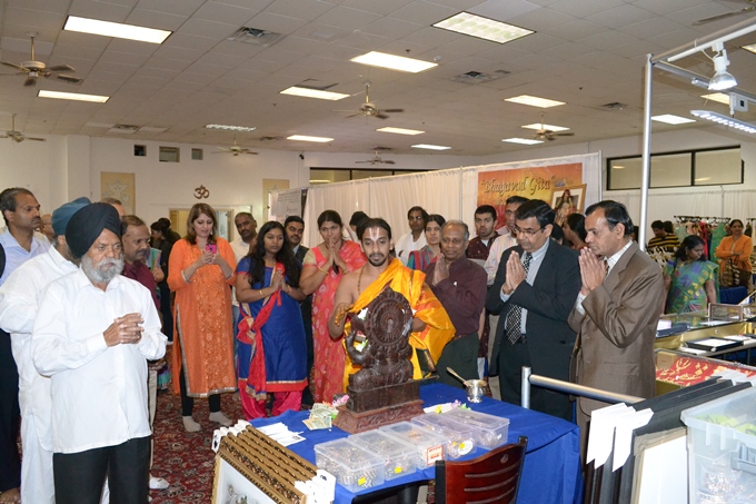 Around 11am temple priest Sri Ravi Shankar performed the pooja ceremony conferring New Year blessings to the vendors in the auditorium who heralded the New Year day with brisk business. Vendors mall was colorful with display of jewelry, housewares, garments, and accessories. The nonprofit organizations spread their messages to attentive devotees.