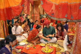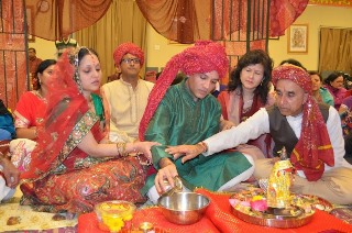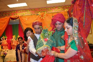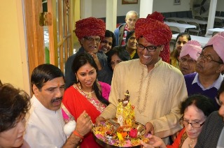 On Sunday, November 2, 2014, the marriage of Tulsi Devi with Lord Krishna was performed as a traditional Hindu wedding with festive atmosphere. A mandap was set up in the middle of the Shree Mandir prayer hall. The bride (Tulsi Devi) was clothed in a sari and ornaments including earrings, necklaces, bangles, etc. The groom, a brass image of Lord Krishna, was clothed in a dhoti. Both Lord Krishna and Tulsi Devi were bathed and decorated with flowers and garlands before the wedding.