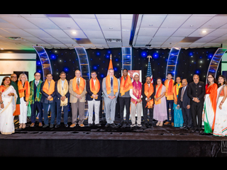 [Left] Consul General Ramesh Babu Laxmanan shares stage with elected representatives, diplomats, and USHA volunteers at the Vande Bharatam Dinner.
