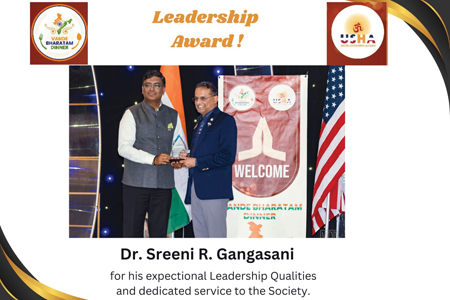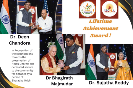 Several prominent leaders of the community were honored at the event. Dr. Deen Bandhu Chandora, the founder of the Vedic Mandir in Lilburn and the author of numerous books on Hindu Dharma, as well as Dr. Sujatha Reddy and Dr. Bhagirath Majmudar were recipients of USHA’s Lifetime Achievement Award.