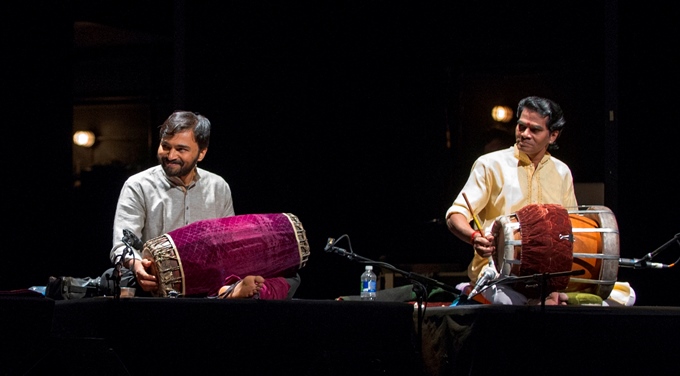 Anantha Krishnan on the mridangam, and Mannargudi Vasudevan on the thavil. (Photo: Judy Ondrey)