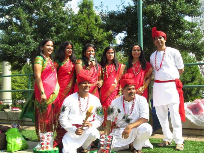 The adults were not to be left behind, with their energetic and quality dance performances. Aadithya Prem, a long time favorite, and Mahek Patel of Mahek Dance Academy performed a fusion dance, with beautiful moves and striking costumes. A gopika-kolatam folk dance, choreographed by Swetha Pakala, was performed by "Natya Mayuri": Swetha, Vidya Ktragadda, Anu Khandavalli and Neelima Sunder Sen. A koli (fisherman dance) from Maharashtra was performed by enthusiastic couples, Mrunal/Sanjay Saggere, Radhika/Sandesh Shinde and Dipti/Sunil Kulkarni, dressed in the unique koli costumes. The popular, fast paced lavani, performed by Neha Worlikar Patil and Ruchi Dave Iyengar, was a huge success. Both the lavani and koli were choreographed by Neha who has been training a lot of groups for Maharashtra Mandal. The jogwa, a prayer dance paying homage to Goddess Durga, was performed by Pratima and Jaywant Dhumal, Vandana and Shailesh Pawar, Neeta Sorte, Manjula Kirangi, Rekha Yadav, and Sushil Varma. The dance, choreographed by Pratima, ended with the formation of the raudra roop of Goddess Durga, making for a really good photo-op. Adding a completely different flavor to the show was the high energy performance of Zumba, a popular dance cum exercise routine, led by Shiela Devlia of "Z Fitness with Shiela" accompanied by Hema Vishwanathan and Prina Patel.