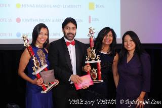 To decide on the winners, the audience texted their favorite performer codes and the votes were counted in real time to arrive at the award winners. Pramod and Pratima Sajja won the award for the couple raising maximum funds for the event. They also won the first place for the audience choice award. The runners-up award for audience choice went to Alpa Amin and Amit Malik. State Representative Brenda Lopez gave away prizes to the winners.