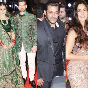 The wedding reception of Neil Nitin Mukesh and Rukmini Sahay at a plush Mumbai hotel on February 17 saw the who’s who of Bollywood turning up to wish the newlyweds, among them Amitabh and Jaya Bachchan, Rekha, Salman Khan, Bipasha Basu, and Karan Singh Grover. But the ones who really stole the limelight that evening were Salman’s former flame Katrina Kaif, resplendent in a saree, and his rumored present girlfriend, Lulia Vantur, looking striking in a black lehenga choli.