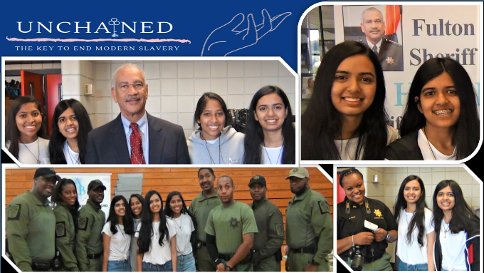 This year on October 12, 2019, they kicked off their movement ‘UNCHAINED: The Key to End Modern Slavery’ together with Trisha Patil and Tanvi Patil at the H.Y.P.E. Youth Conference in Atlanta organized by the Fulton County Sheriff’s Office. The Fulton County Sheriff's Office posted Unchained's movement on their official Instagram with the caption “@unchained2019 members work to educate everyone on the dangers of human trafficking. They presented Sheriff Jackson with a key necklace which symbolizes their efforts. Thanks, ladies!!! Keep up the great work!!!” -- https://www.instagram.com/p/B3il3t8FE1p/